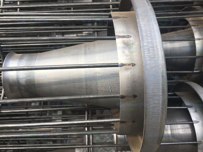 1、除塵器骨架采用圓型結(jié)構(gòu),袋籠的縱筋和反撐環(huán)分布均勻,并有足夠的強(qiáng)度和剛度,防止損壞和變形,頂部加裝冷沖壓短管,用于袋籠的垂直及保護(hù)濾袋口在噴吹時(shí)的磨損。