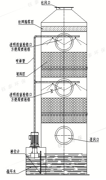 通過水循環(huán)噴霧,氣體從下方上升,水從上到下循環(huán)過濾廢氣中的灰塵和雜質(zhì)并通過中和反應(yīng)和水來處理廢氣。洗滌器處理酸堿廢氣一般可以達到90%以上的效果。
