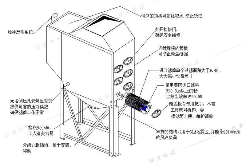 2.1、設備外型結構特點:整體結構嚴密,連續(xù)焊接的管板可防止粉塵的泄露。設備機體采用酸洗除銹,底漆、面漆采用環(huán)氧漆噴涂,環(huán)氧漆附著力強,涂膜柔韌耐磨,耐化學腐蝕性能優(yōu)良,有極好的耐水、耐油、耐酸堿、耐溶劑性。